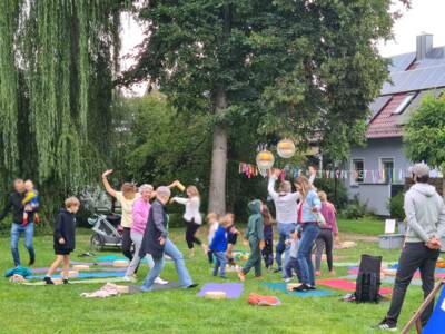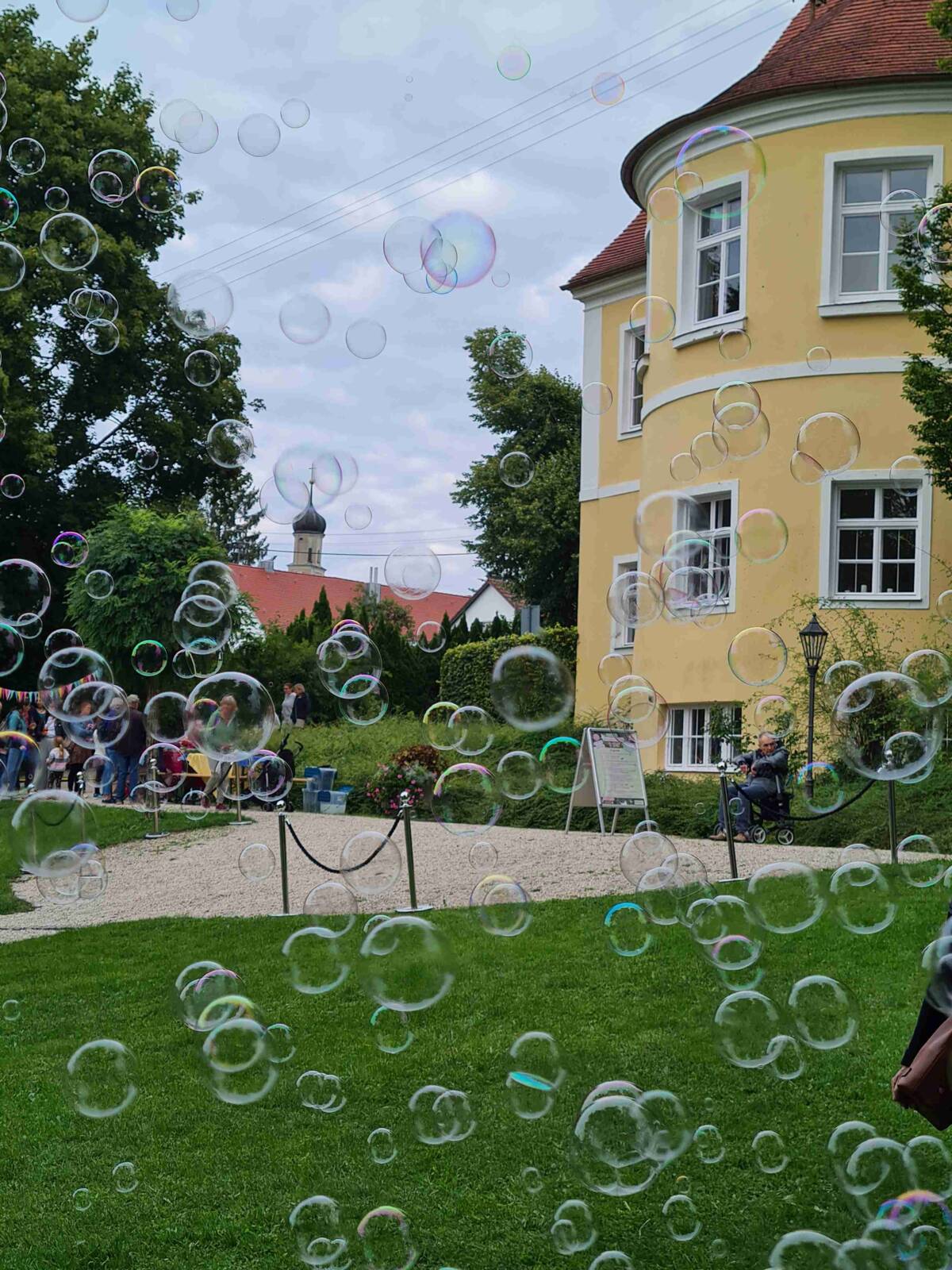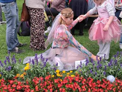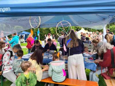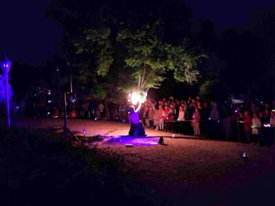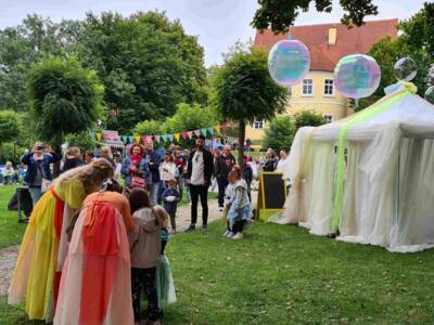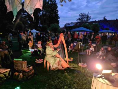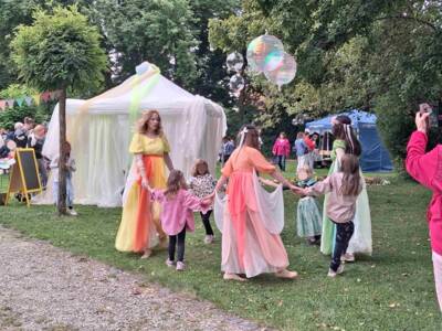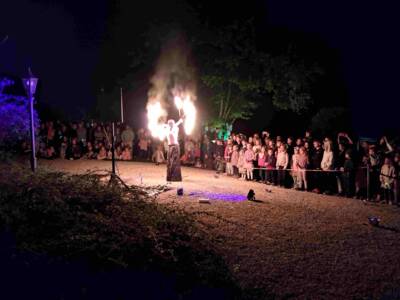 Die magische Welt der Elfen, Waldfeen, Kobolde, Trolle und sonstigen Fabelwesen ist faszinierend für alle Altersklassen. Der Andrang zur Premiere von „Abendwind und Feenstaub“ Ende August war unerwartet groß. Rund 2000 große und kleine Besucher nutzten über den Tag verteilt das märchenhafte Angebot im verwunschenen, magisch dekorierten und beleuchteten Park des Unteren Schlößchens: Seifenblasen wehten durch die Parkanlage, Gnome versteckten sich an Baumstämmen, kleine leuchtende Pilze schossen bei Einbruch der Dämmerung aus dem Boden, Schmetterlinge flatterten an den Sträuchern. Zarte, himmlische Harfengesänge erklangen im Park, Elfen tanzten durch die gesamte Parkanlage und animierten zum Mitmachen, auch Blütenkränze konnten im Elfenschloss gebastelt werden. Die kleinen Besucher erfreuten sich zudem an sagenhaften Märchenerzählungen im Abendwind, vorgetragen von Margrit Horsche und dem Schlossherrn Klaus Förster, am beliebten Kinderschminken, beim Traumfängerbasteln, bei der Herstellung von glitzernden Zaubergläsern oder auch Seifenblasenjagen. Auch für die Erwachsenen gab es ein entsprechend magisches Angebot im Programm: Feen- und Drachen-Yoga auf der Schlosswiese, Workshops zum Herstellen von Kräuterseifen und handgefertigtem Räucherwerk, aber auch eine Märchenstunde für die großen Besucher. Eine spektakuläre Feuershow zum Abschluss des wortwörtlich sagenhaften Programms rundete die gelungene Premiere ab.